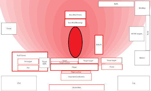 I've spent a lot of time on keybinds and on finding good mods that meet my needs. But I realize that my basic layout could also use a bit of work. So I decided to really sit down and analyze how the UI is laid out on the screen. First I looked at my first principle: keep your character and surroundings clear. I created a mock-up of the screen showing about where the character would be and then tried to decide exactly where the most important parts of his 'surroundings' were.